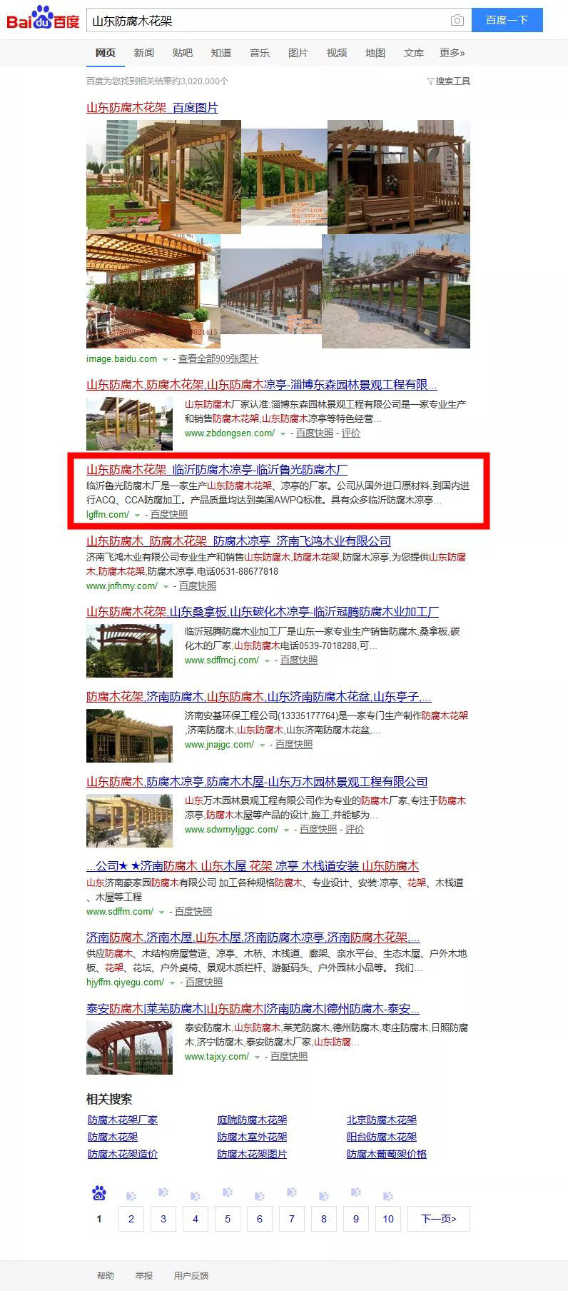 临沂鲁光防腐木厂是一家专业生产山东防腐木花架、临沂防腐木凉亭的企业。从国外进口防腐木原材料,到国内进行ACQ,CCA防腐加工产品质量均达到美国AWPQ标准,并常年聘请业内技术专家从事研究和指导生产。