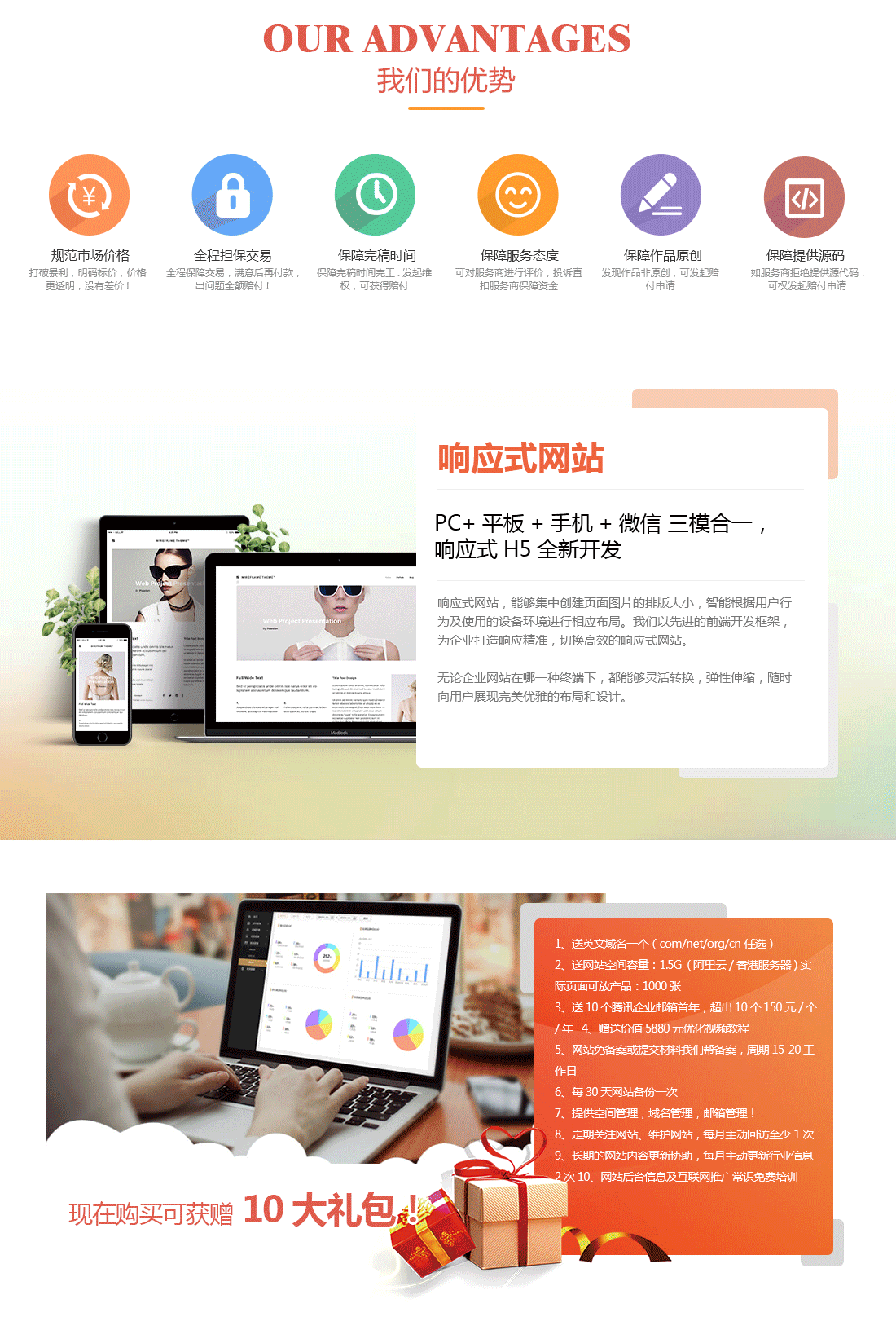 商品特点:PC+平板+手机+微信 三模合一,响应式H5全新开发